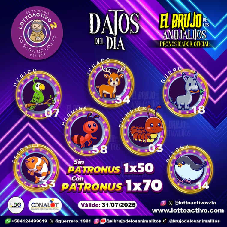 Navegación de entradas Pronósticos para Trio Activo El Patronus hoy Jueves 31-07-2025 Pronósticos para Lotto Activo hoy Viernes 01-08-2025