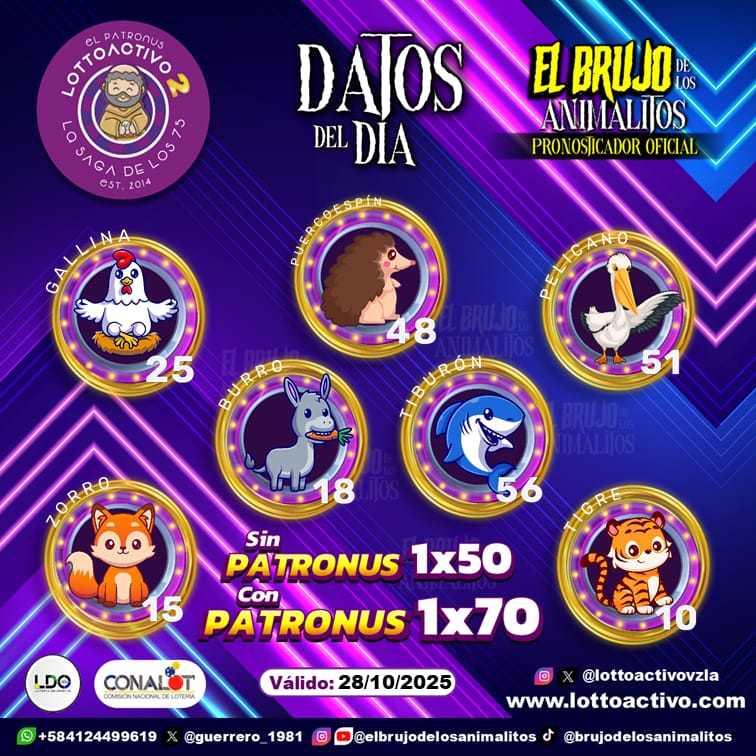 Pronósticos para Trio Activo El Patronus hoy Martes 28-10-2025 Oct 28, 2025 El Brujo de Los Animalitos