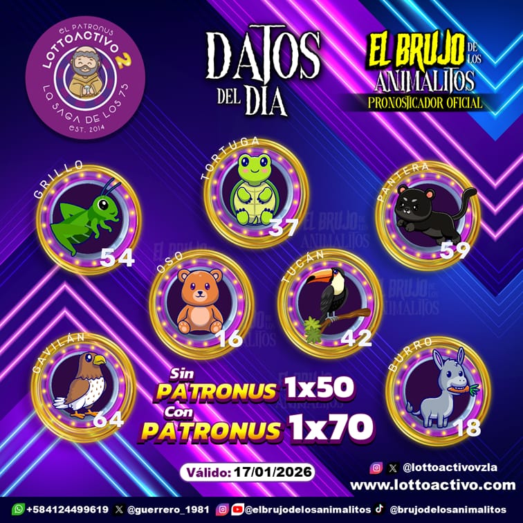 Pronósticos para Trio Activo El Patronus hoy Sábado 17-01-2026 Ene 17, 2026 El Brujo de Los Animalitos