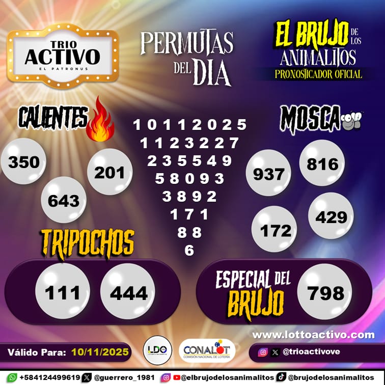Pronósticos para Trio Activo El Patronus hoy Lunes 10-11-2025 Nov 10, 2025 El Brujo de Los Animalitos